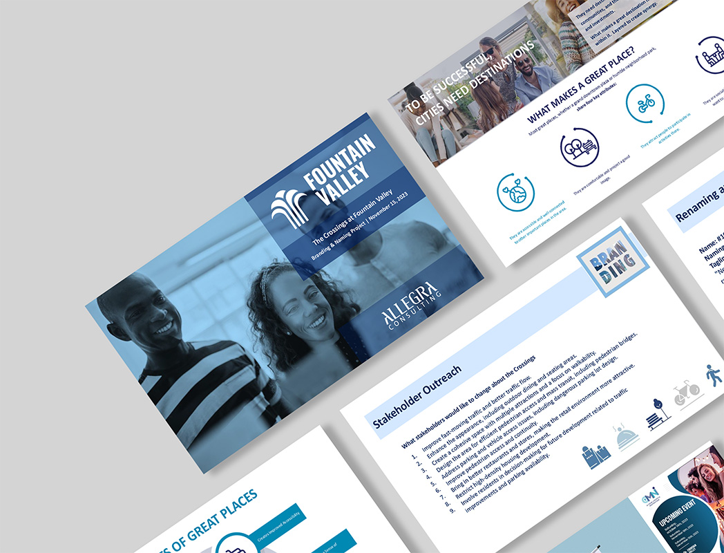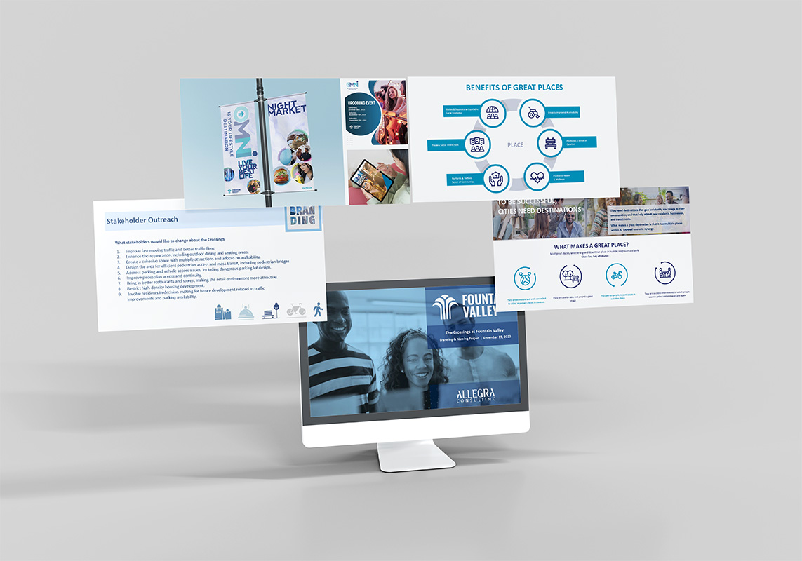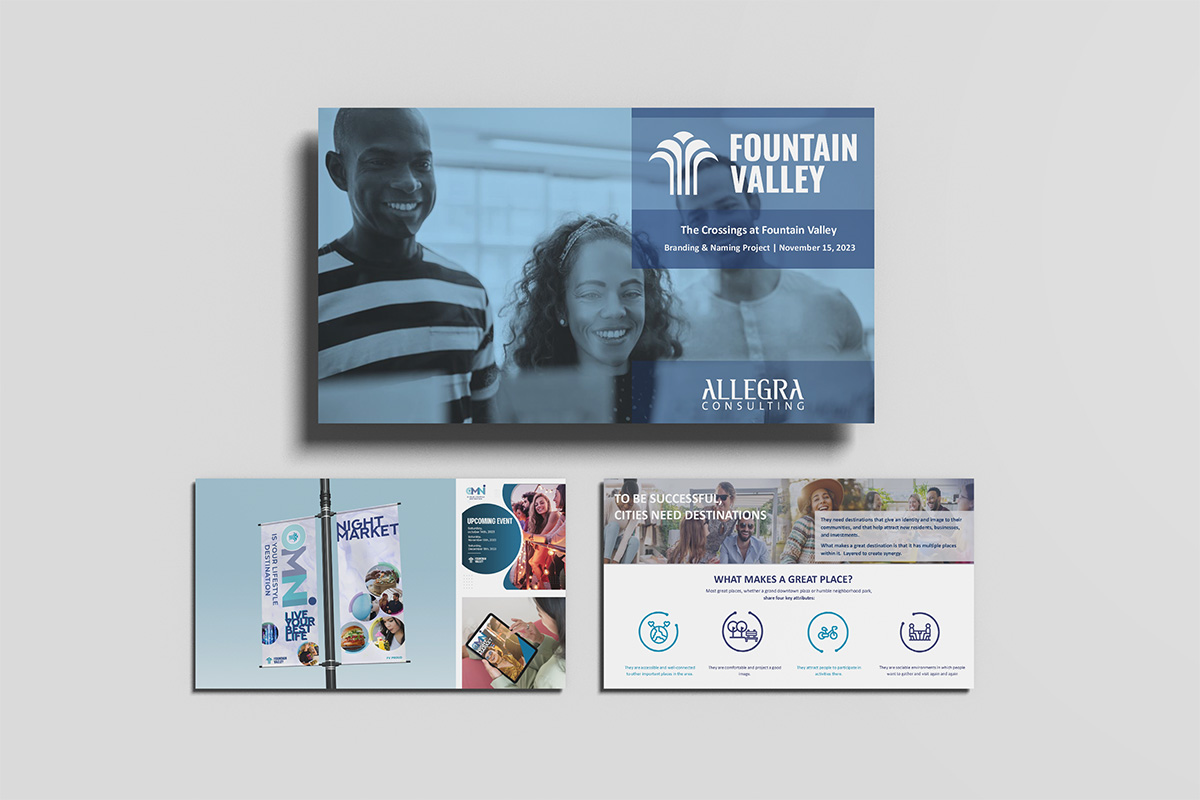 Together, these deliverables—ranging from the City of Fountain Valley’s comprehensive Brand Identity Guide to the Stakeholder Outreach and Naming Report for the 162-acre redevelopment project, along with a full suite of economic development collateral, a dedicated website, ICSC trade show exhibits, and branded graphics—demonstrate Allegra Consulting’s ability to translate community input, strategic insight, and creative vision into impactful, citywide marketing and branding solutions that elevate our clients and position them for long-term success.